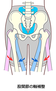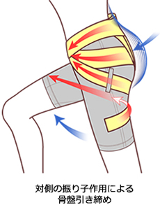 また、骨盤ベルトの内外引っぱり強度の強弱により、O脚用は内側に、X脚用は外側に股関節の軸を戻す軸補整が脚の軸を正常な方向に戻します。