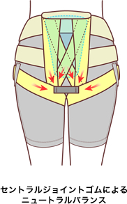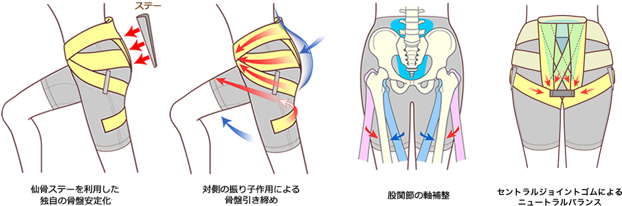 背側仙骨部にステー(下図参照)を利用した独自の骨盤安定化と歩く時の対側脚の振り子作用を利用した骨盤引き締め、この2つの大事な機能がインナーマッスルを補助しながらあなたの偏った腰を正常な位置に戻すお手伝いをします。